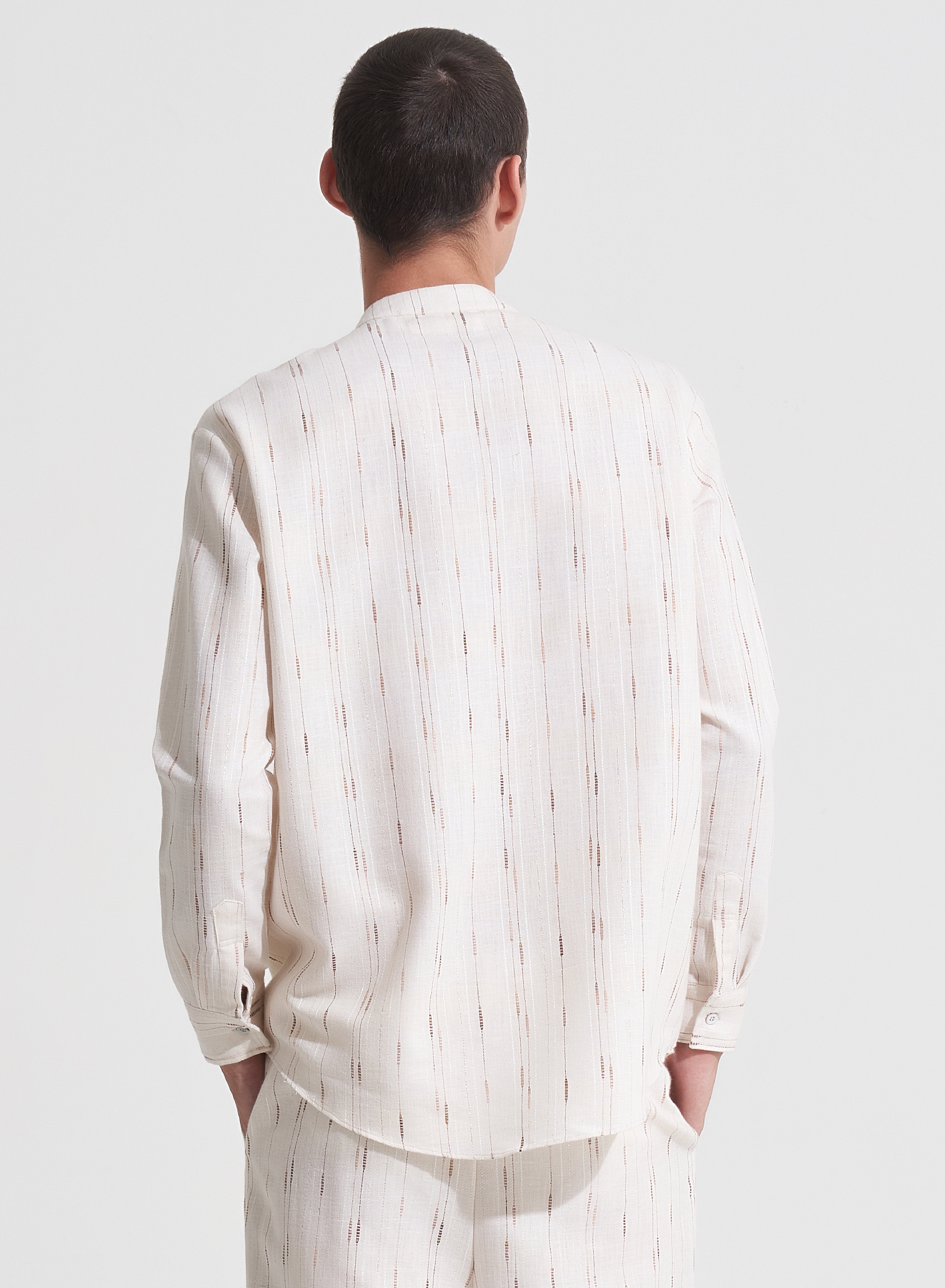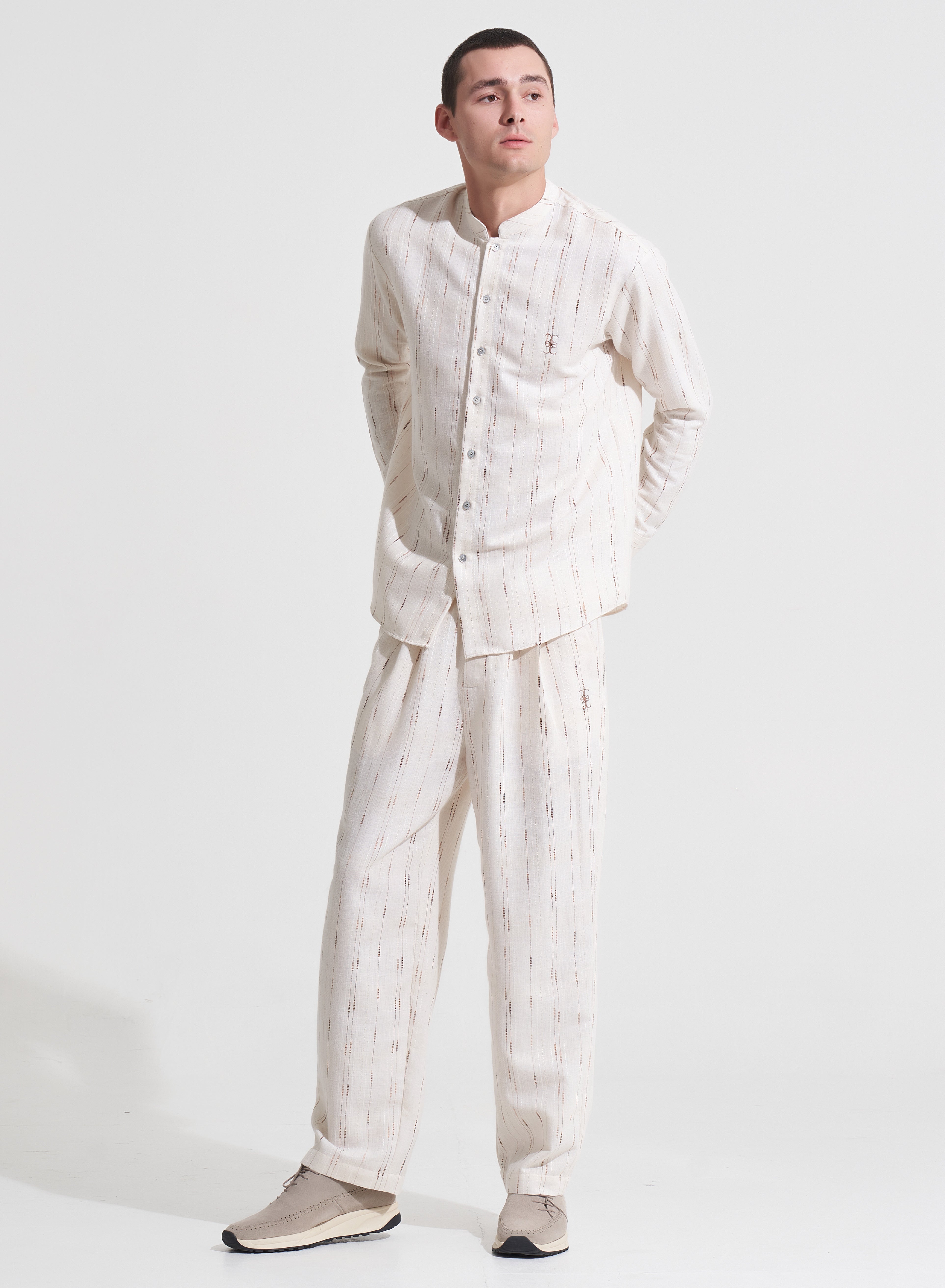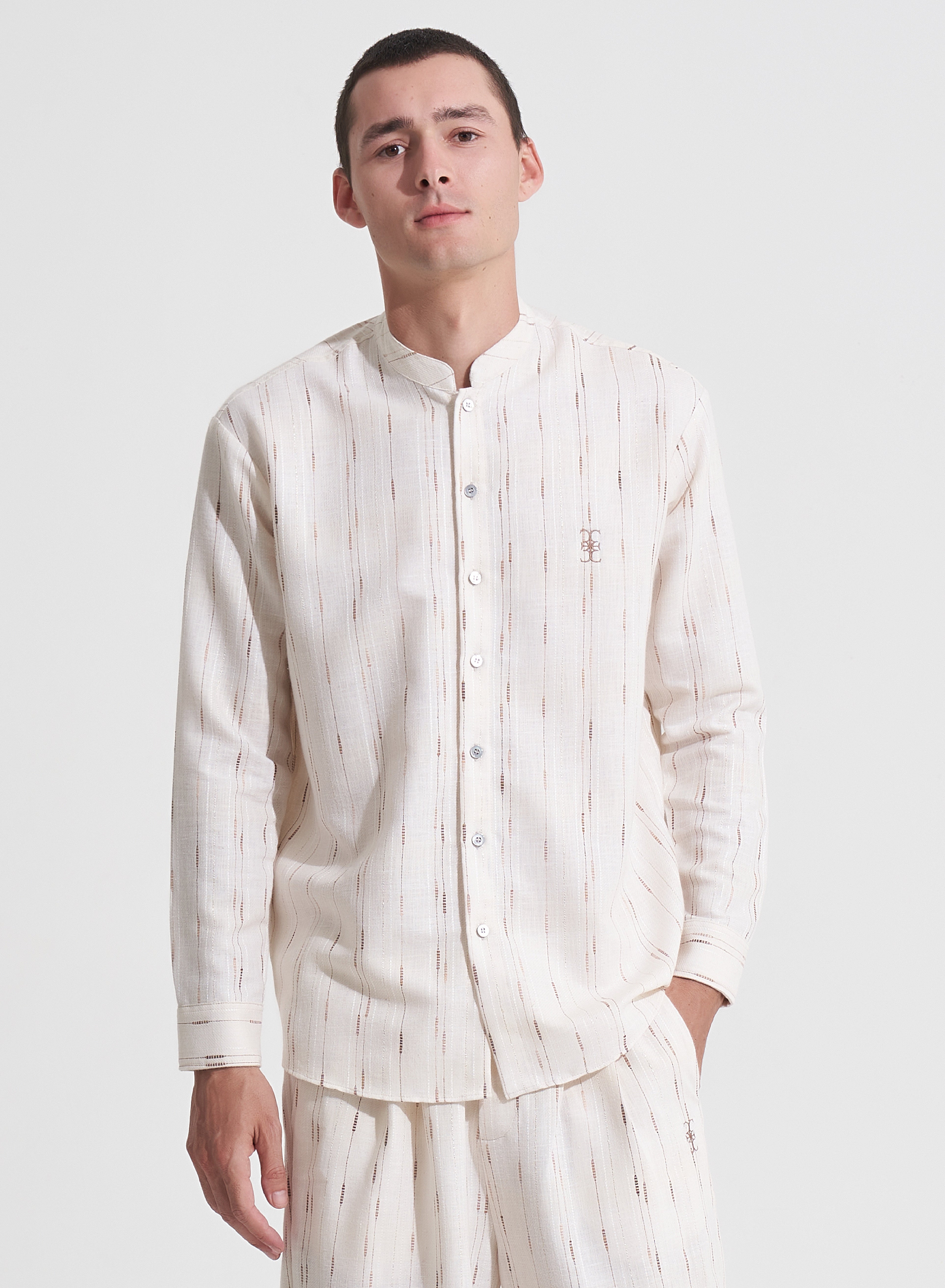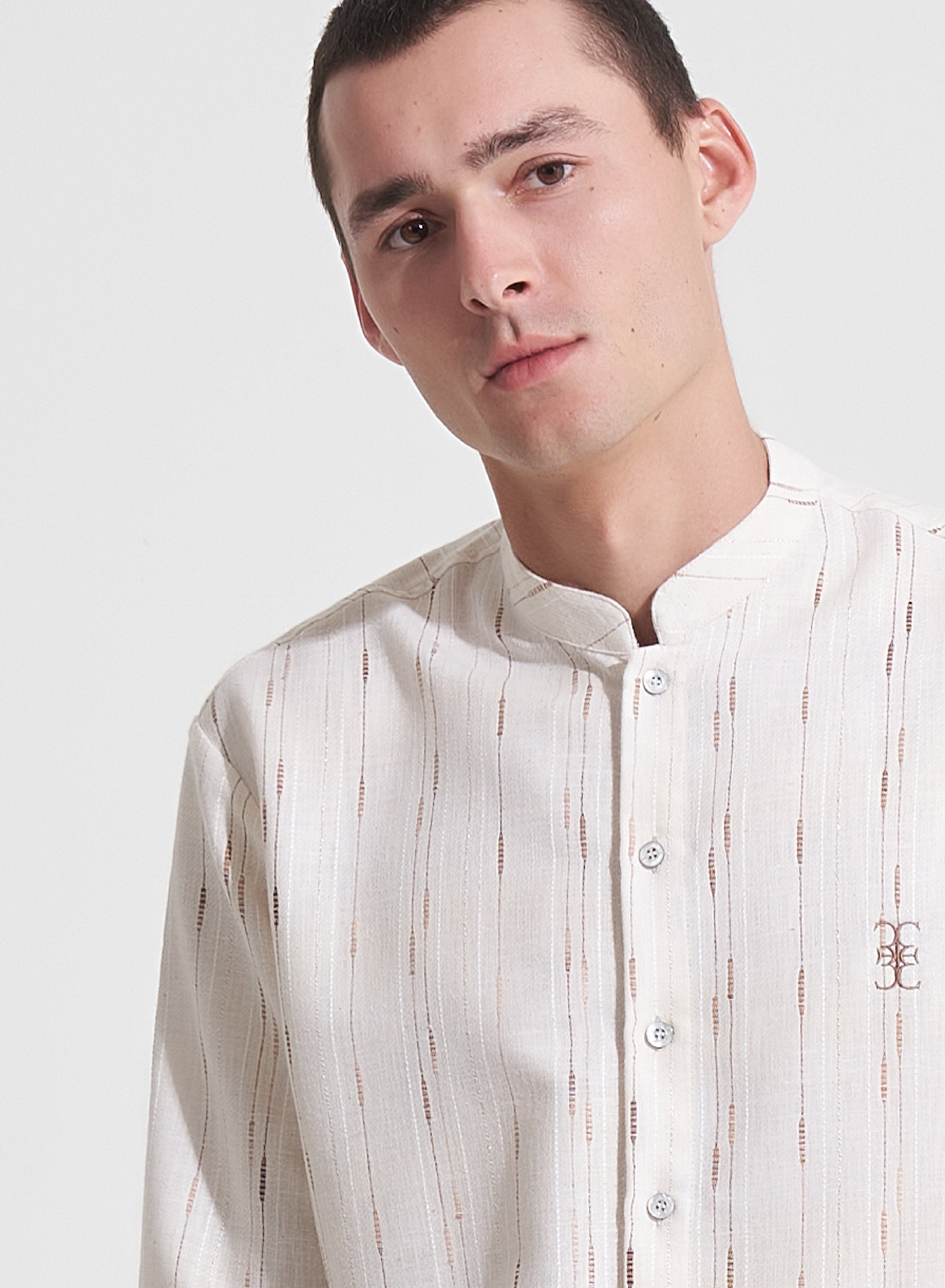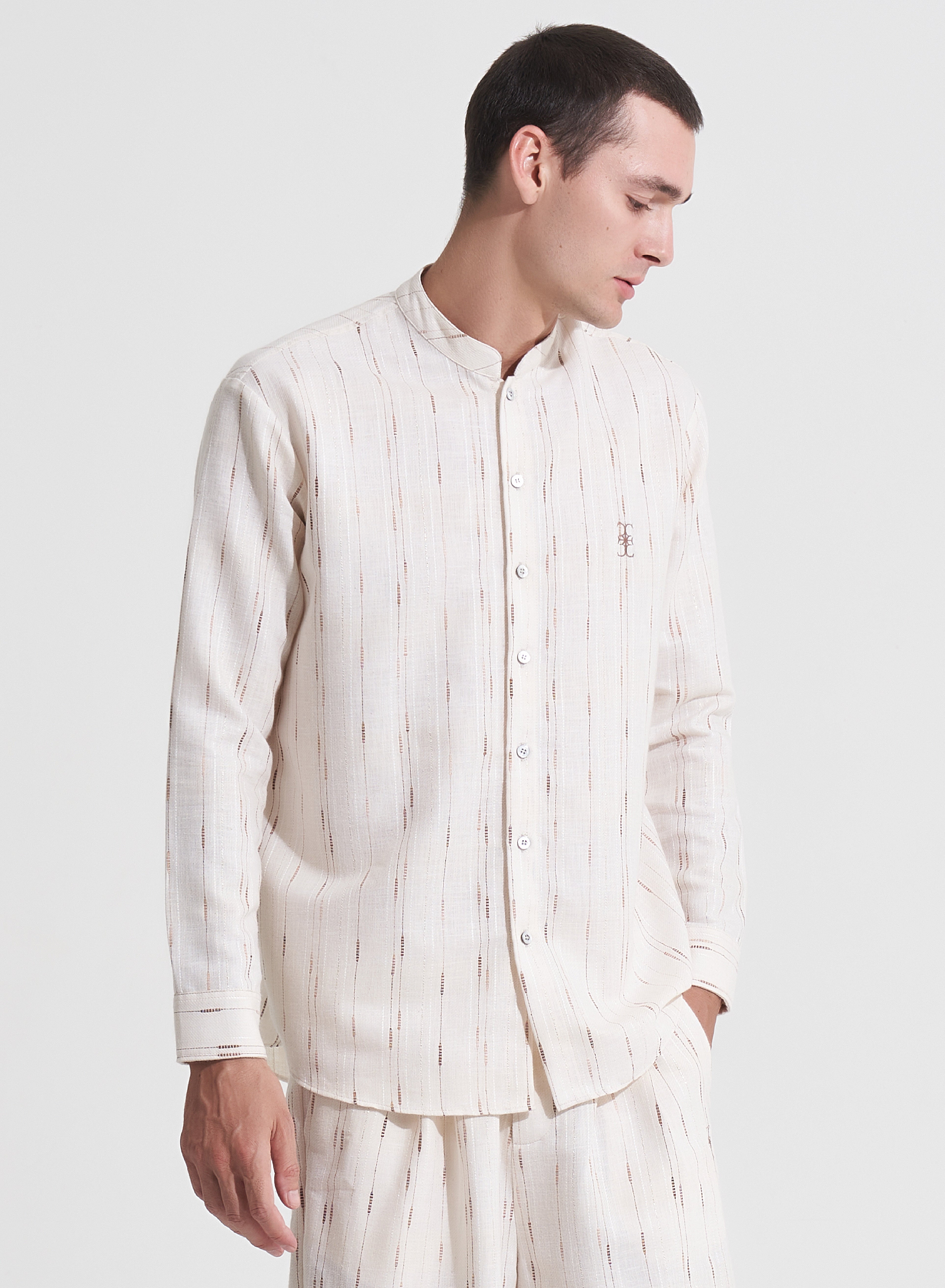 The Taabah Shirt redefines classic elegance with its band collar, shell buttons, and subtly textured fabric. Woven thread detailing creates a refined line pattern, adding depth to its timeless silhouette. A must-have for Eid and beyond.
