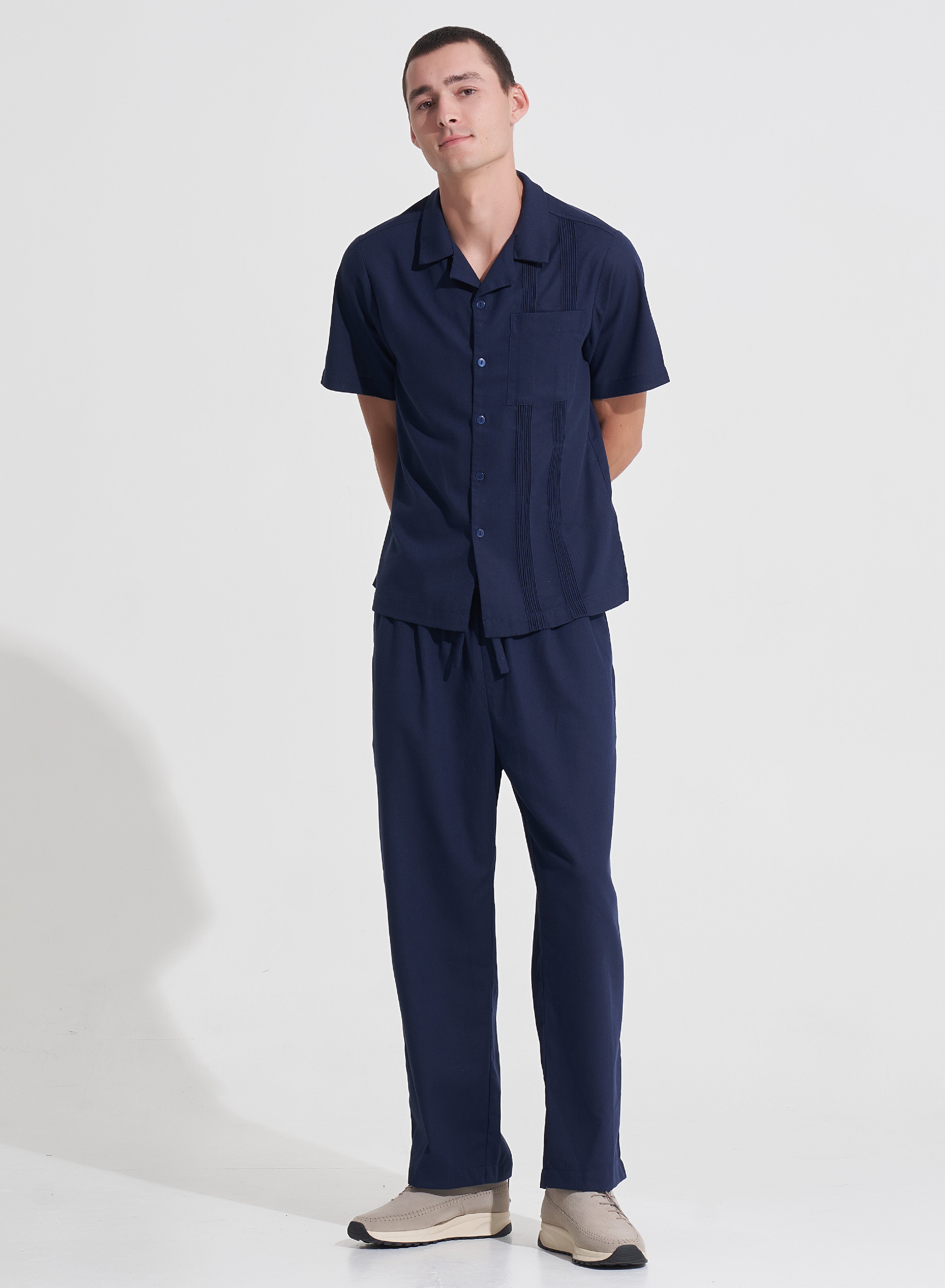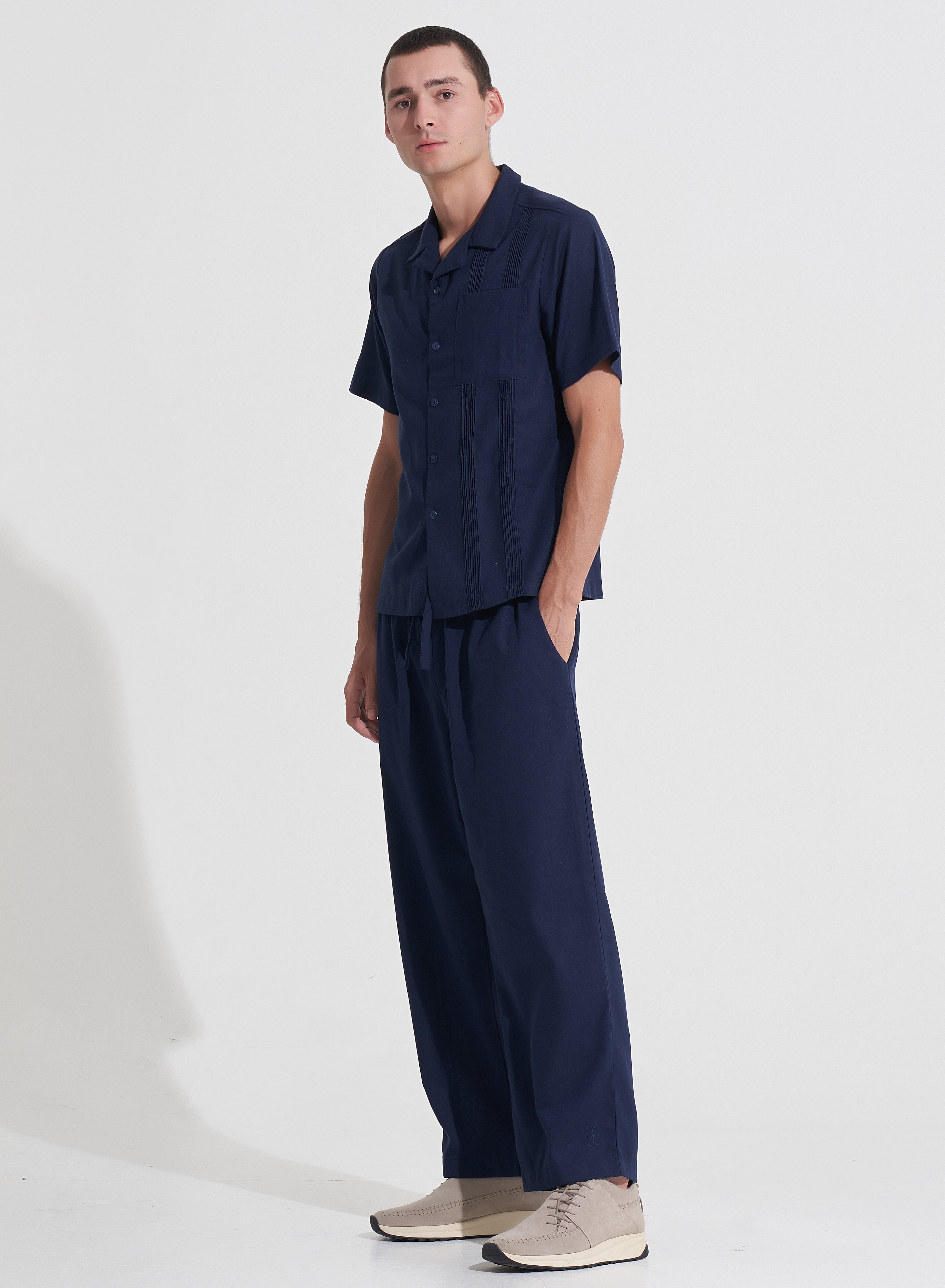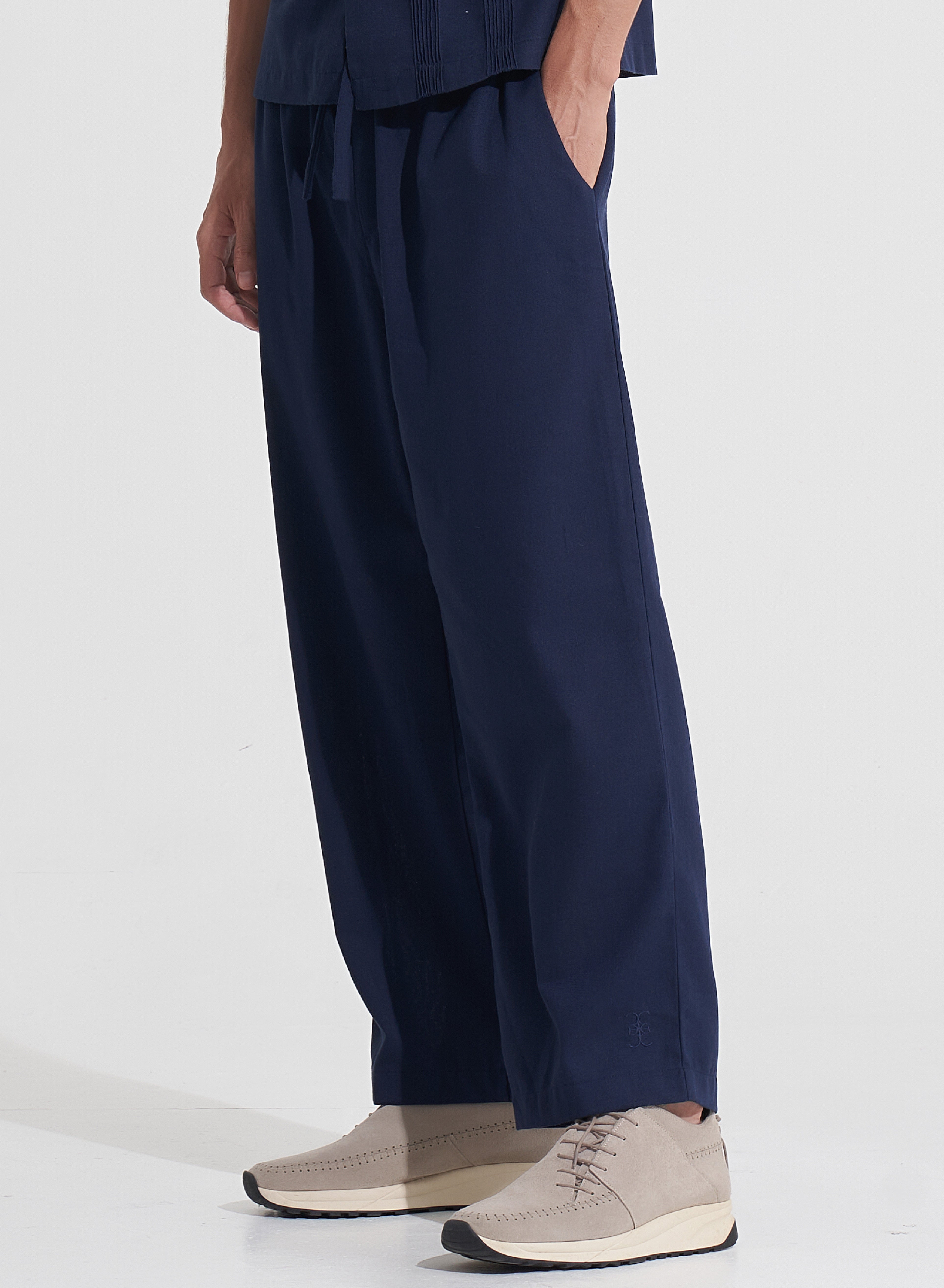 The Damian Pants are your go-to for stylish comfort. They offer a straight-leg silhouette and mid-rise fit. With practical pockets, an elasticized drawstring waistband, and subtle embroidery detail at the hemline, these pants are perfect for any casual or semi-formal occasion. Style with a matching Damian Shirt and sneakers for a polished look.