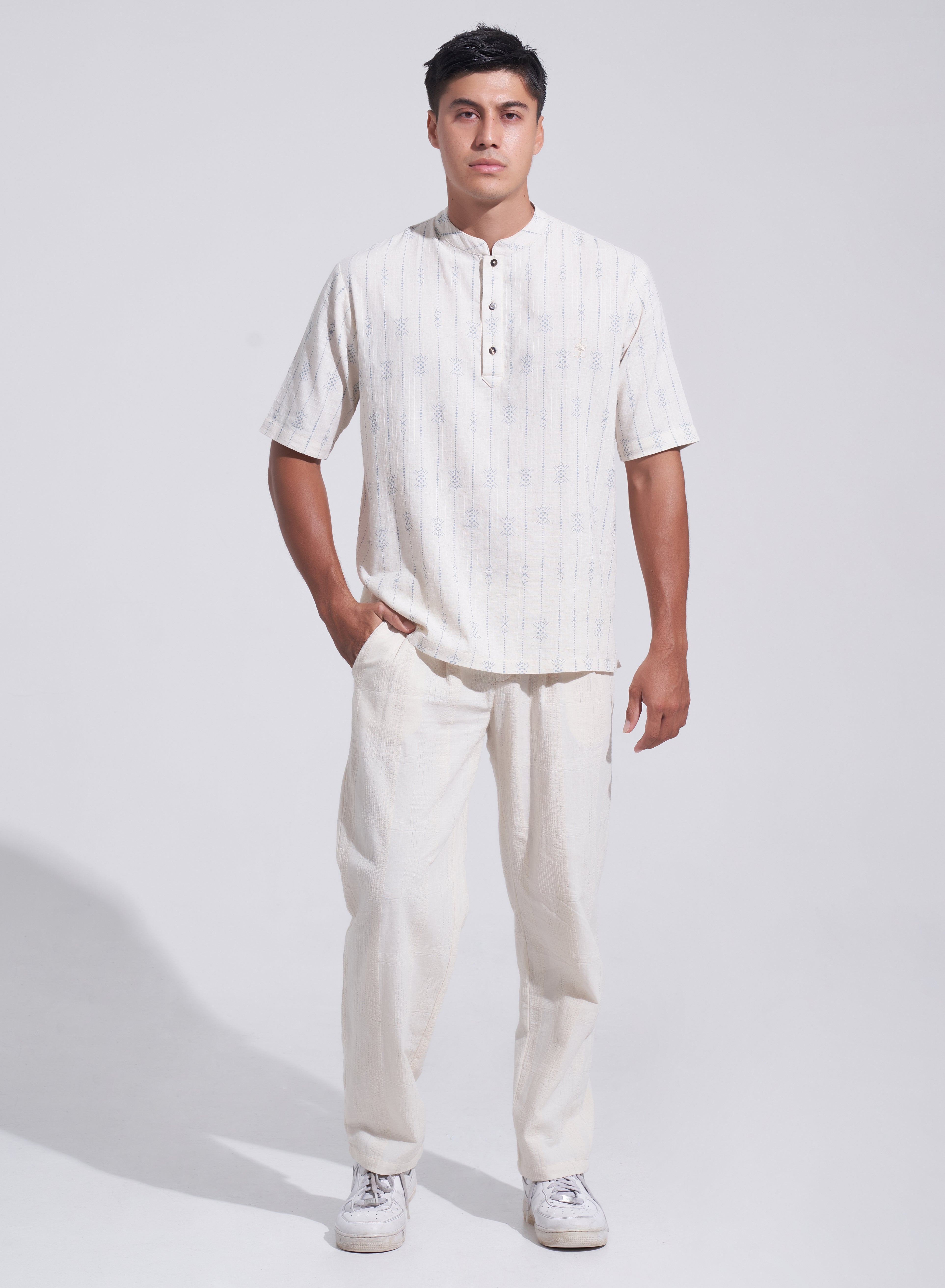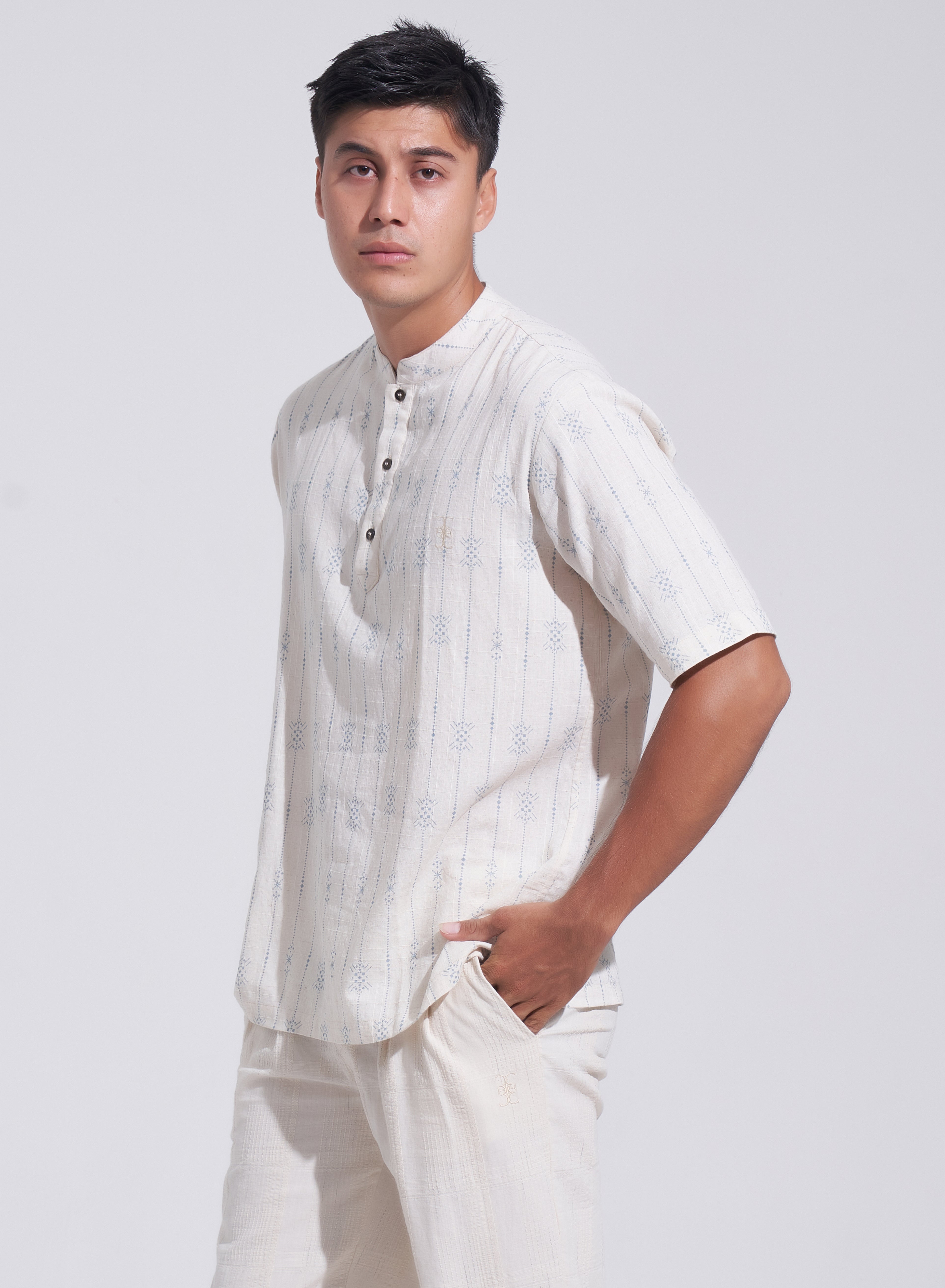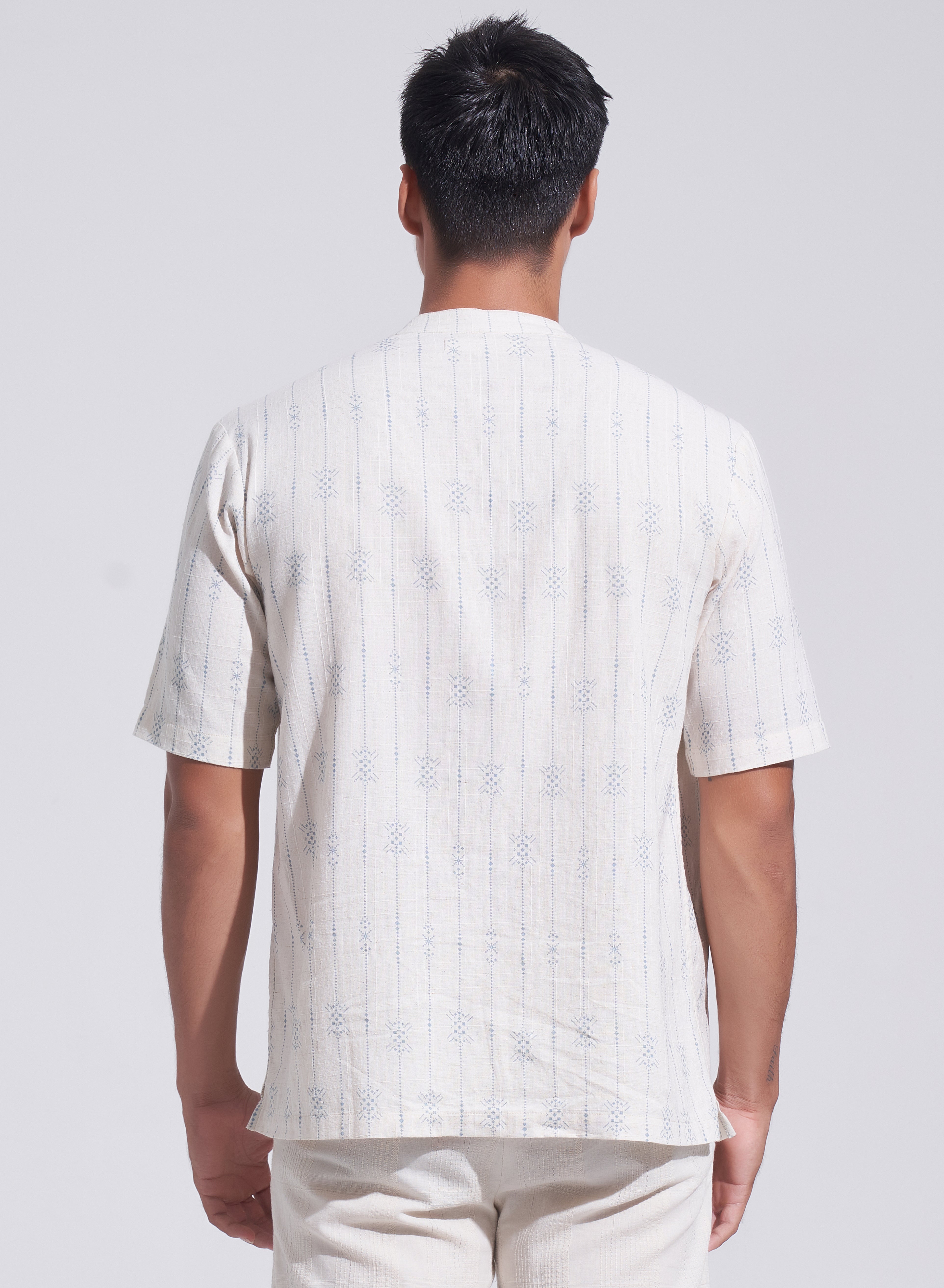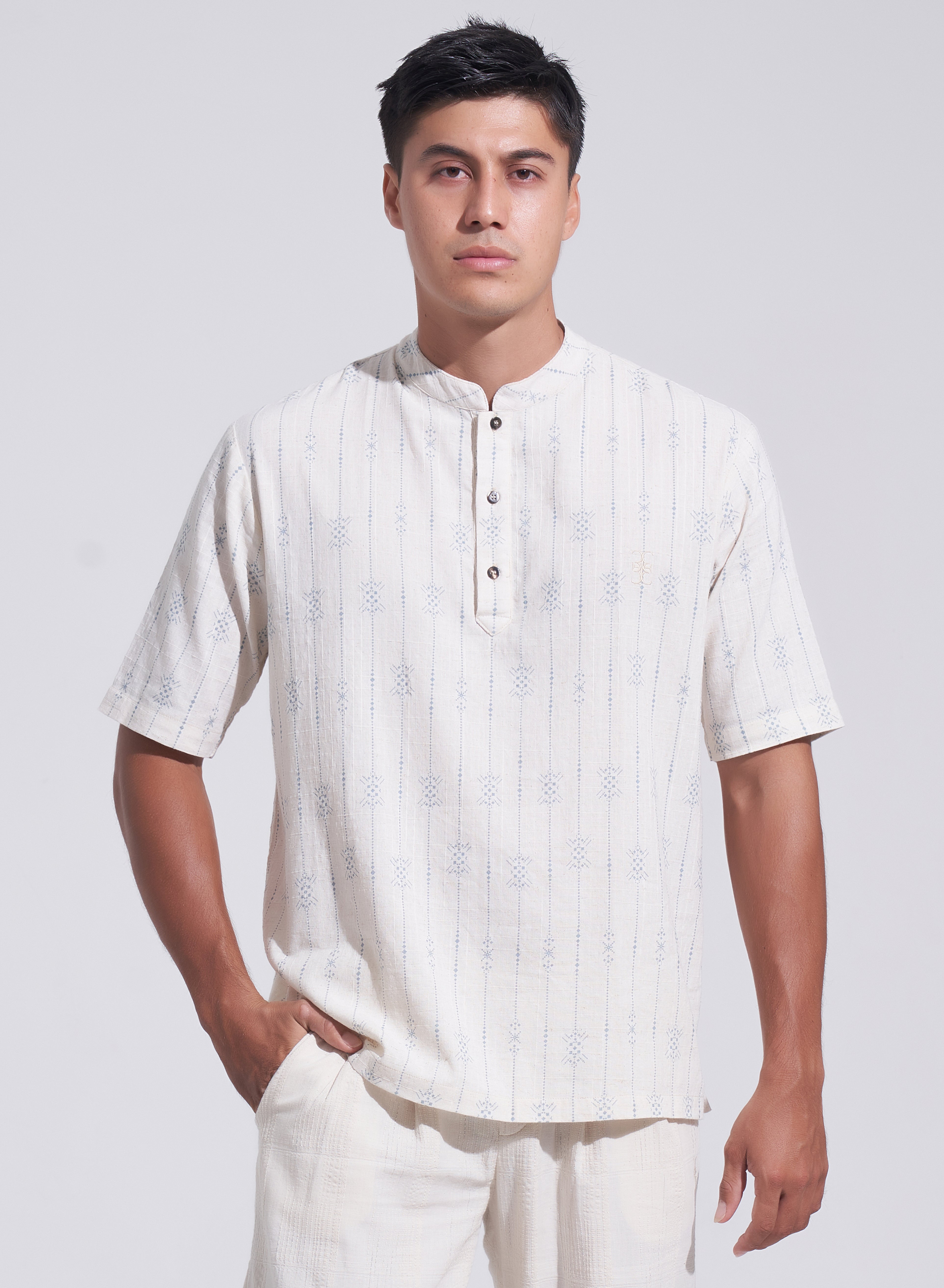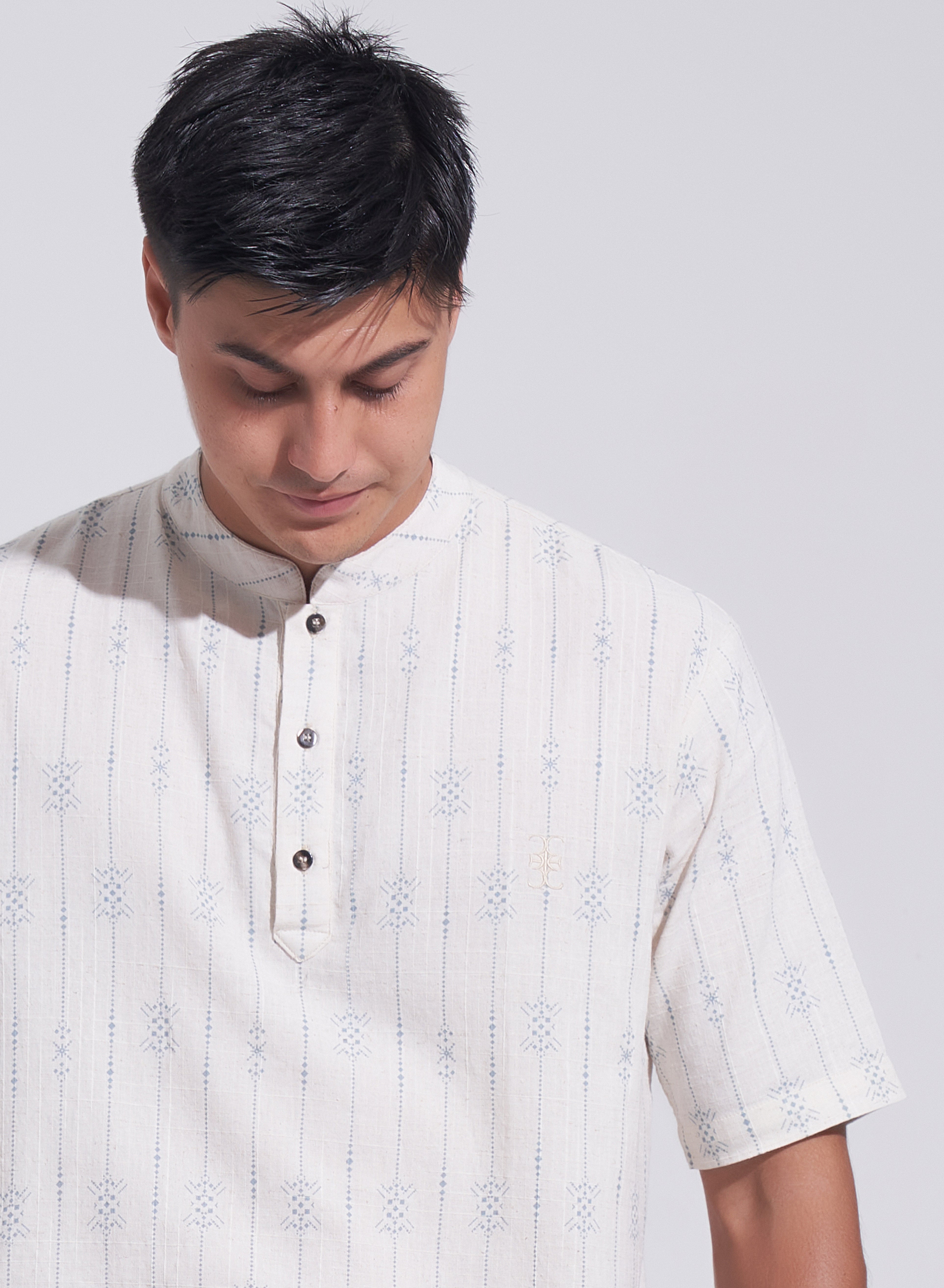 A relaxed take on festive dressing, the Hasan Shirt features a regular fit with short sleeves and a mandarin collar. Finished with a three-button front opening, it’s elevated by a subtle print that feels right for Raya — refined, calm, and easy to wear beyond the occasion.