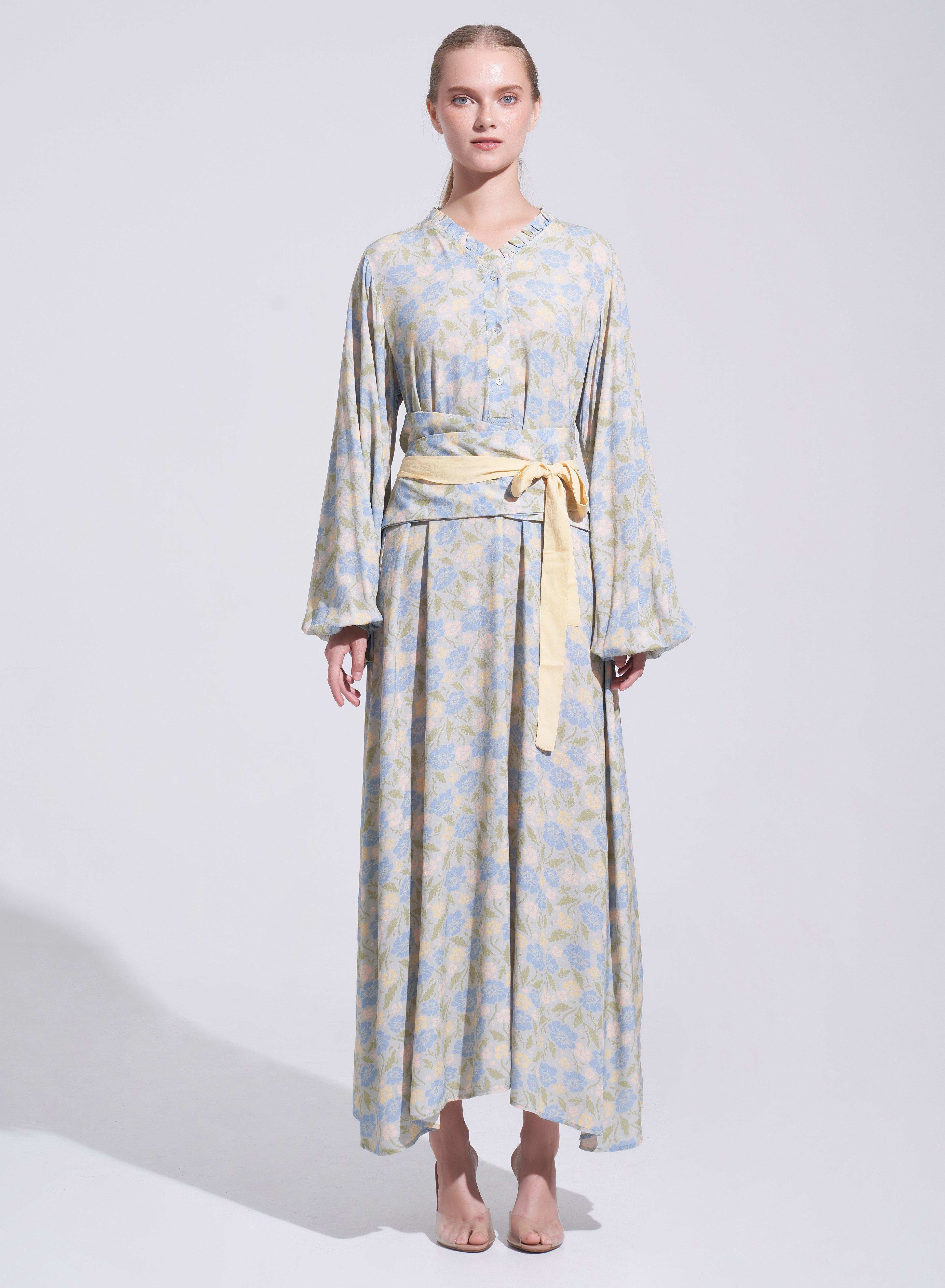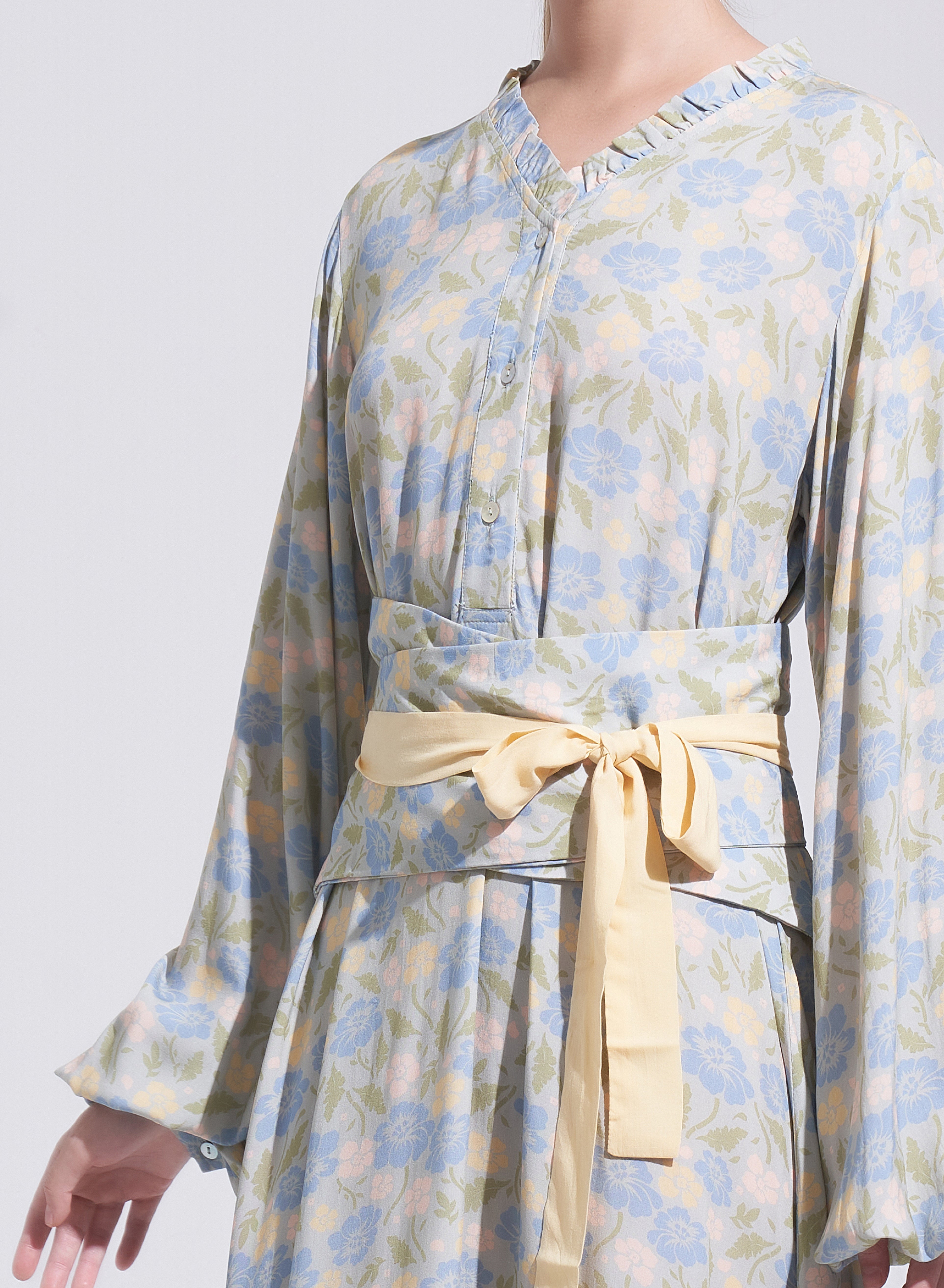 Created to add definition with ease, this Obi Belt features a refined floral print on a soft green base, finished with yellow tie details for a subtle contrast. Wrap and tie to shape the waist or layer over flowing silhouettes, bringing structure while maintaining an elegant, balanced look. A versatile styling piece suited for festive moments and beyond.